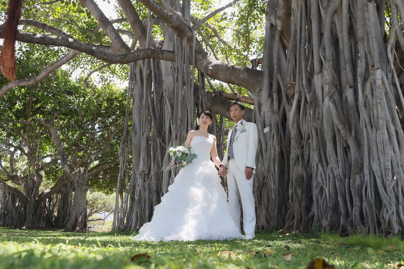 9月上旬の澄み渡るような快晴のもと、12時からの撮影ではアラモアナビーチの海が一段と鮮やかなエメラルドグリーンに輝き、おふたりのとびきりの笑顔をさらに引き立てていましたね。朝のお打ち合わせでサロンにてお選びいただいたドレスも、ハワイの青空やガジュマルの緑にとてもよくお似合いでした。