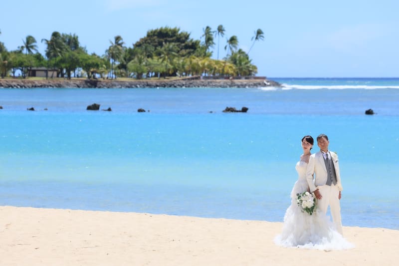 9月上旬のハワイは天候も安定しており、ウェディングフォトには絶好のシーズンです。今回のアラモアナビーチでの撮影開始は12:00。太陽が真上にあるこの時間は、海中の砂地まで光が届き、ハワイの海が最も美しくエメラルドグリーンに輝く「ゴールデンタイム」でもあります。